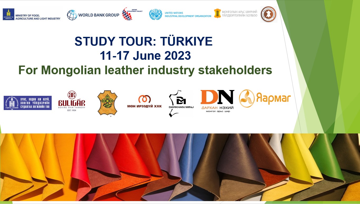 Техник туслалцааны хүрээнд 2023 оны 6-р сарын 11-17-ны өдрүүдэд ЮНИДО нь Монгол Улсын арьс ширний үйлдвэрлэлийн оролцогч талуудад зориулан Турк улсад туршлага судлах аялал зохион байгууллаа. Тус аялалд арьс шир боловсруулах 6 үйлдвэр аж ахуйн нэгжийн удирдлагууд, технологичид, лаборатори, МАШҮХолбоо, ХХААХҮЯ-ны холбогдох төлөөлөл бүхий нийт 16 хүн оролцов. Түүнчлэн Турк улс дахь Монгол Улсын Элчин сайдын яамны 1-р нарийн бичгийн дарга болон Истанбул хот дахь Ерөнхий консул оролцож арьс шир үйлдвэрлэлийн салбарыг хөгжүүлэхэд хоёр орны харилцаа, хамтын ажиллагааг бэхжүүлэх тухай санал солилцов.